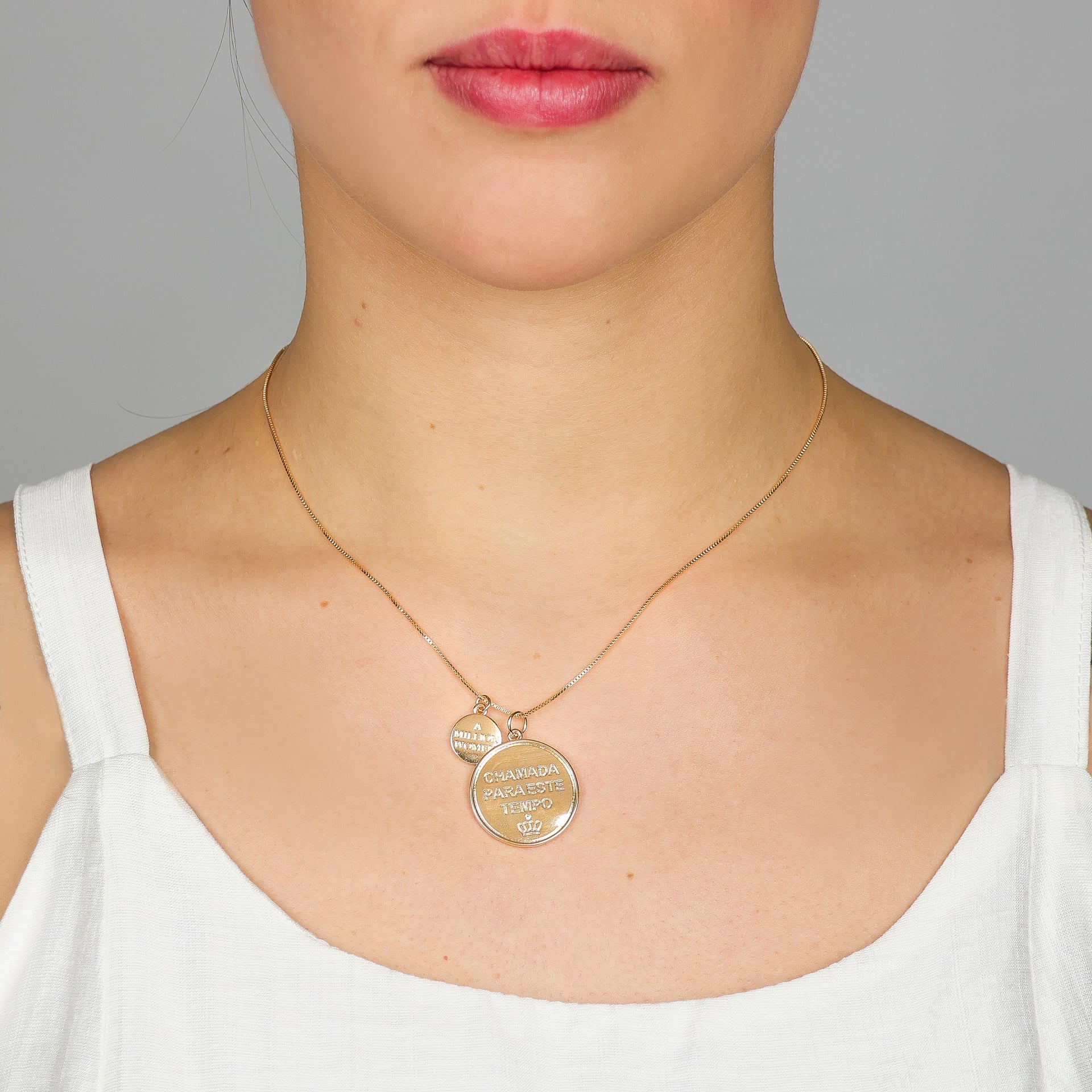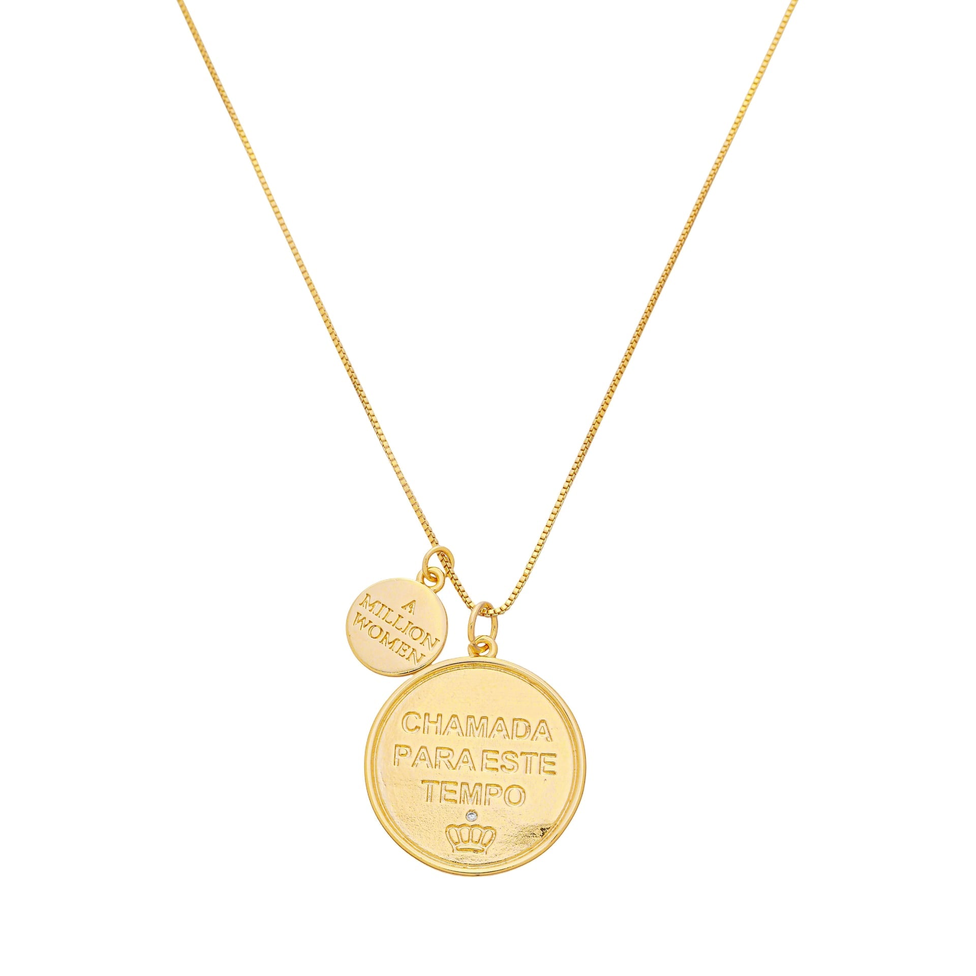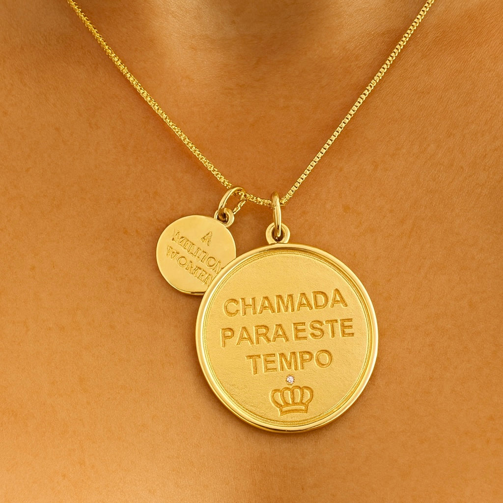 Lindo Colar composto de medalha com a inscrição Chamada para Este Tempo e coroa com detalhe de zircônia e tag com a inscrição A Million Brasil.