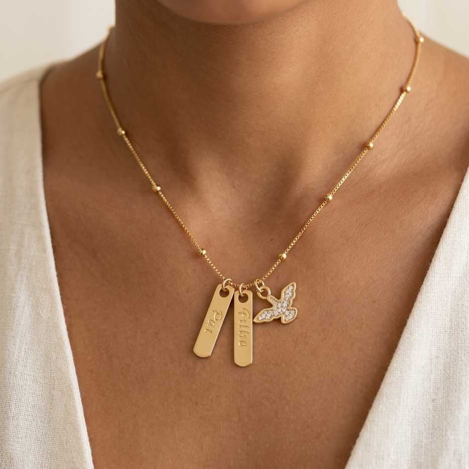 Este colar foi desenhado para representar a essência da Trindade: o Pai que sustenta, o Filho que redime e o Espírito Santo que guia. As duas medalhas gravadas “Pai” e “Filho”se unem ao delicado símbolo da pomba cravejada, trazendo a presença do Espírito Santo como aquele que habita, conduz e fortalece.