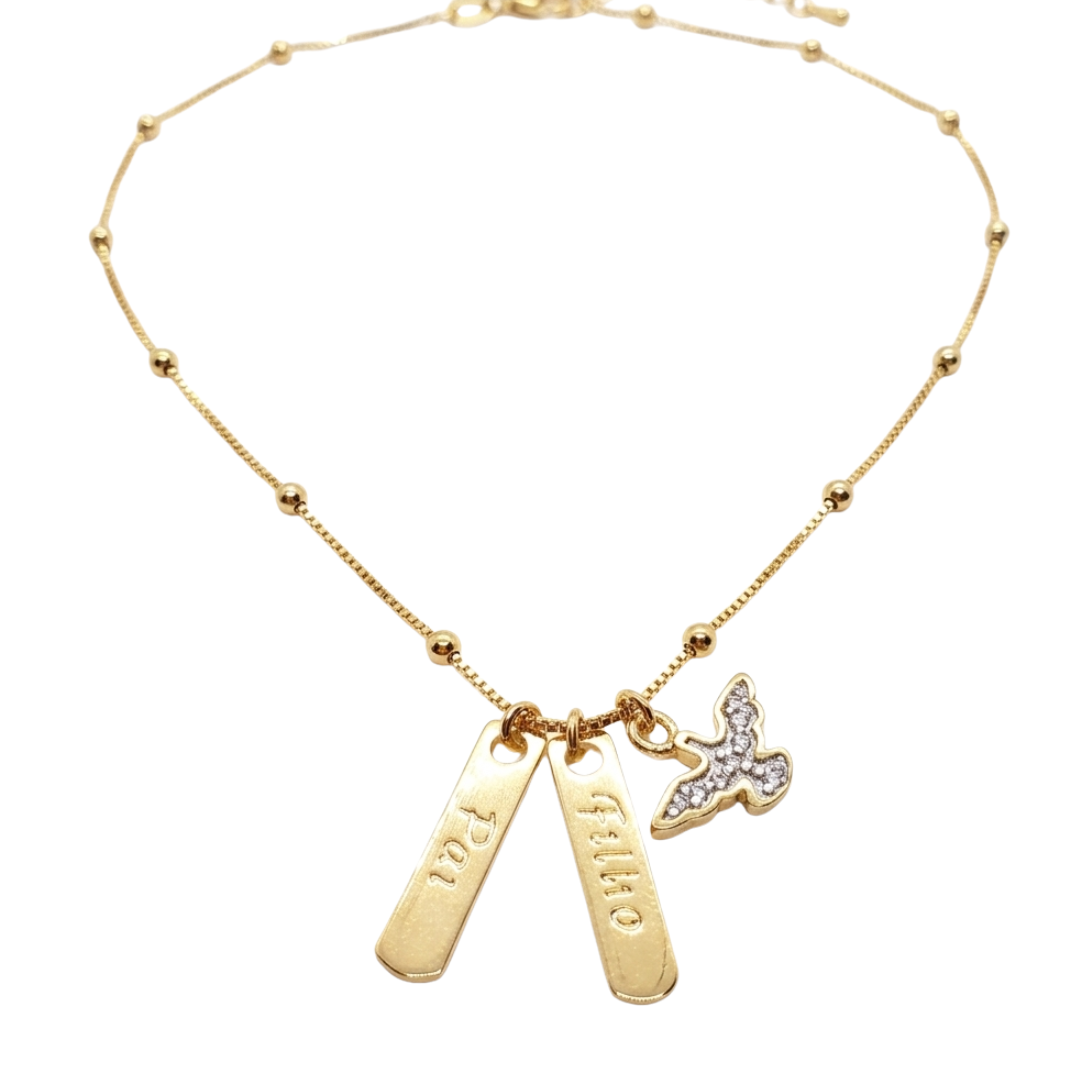 Lindo Colar com duas placas Pai Filho e Pingente Pomba símbolo do Espírito Santo Cravejado de Zircônias.
