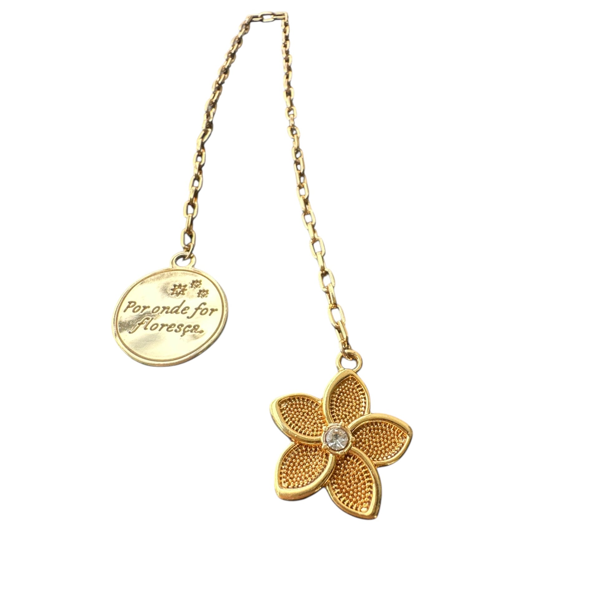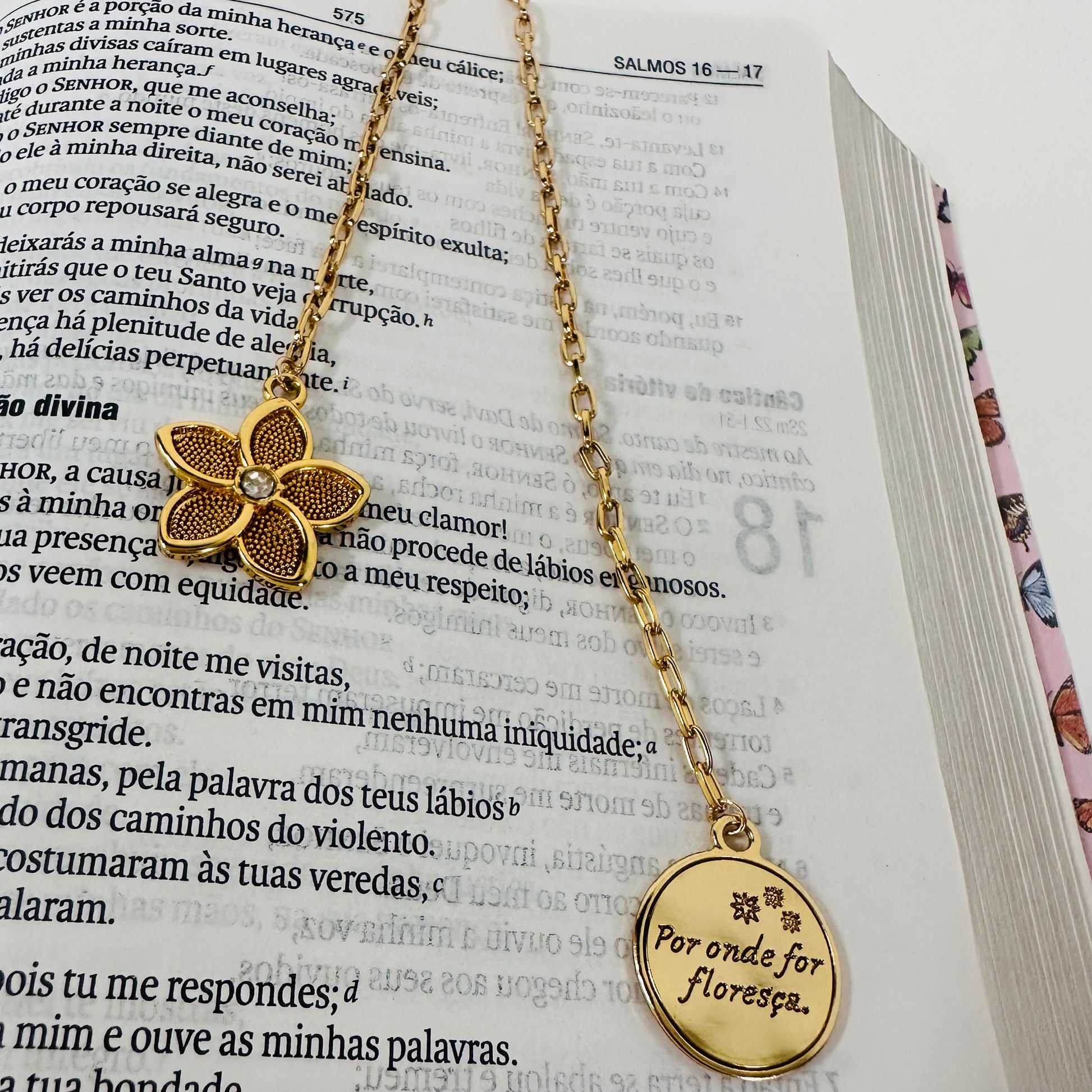 Marcador de Página medalha com inscrição “Por onde for floresça” e flor em metal dourado com cristal.