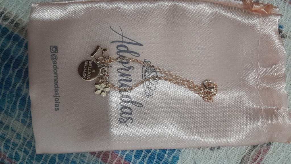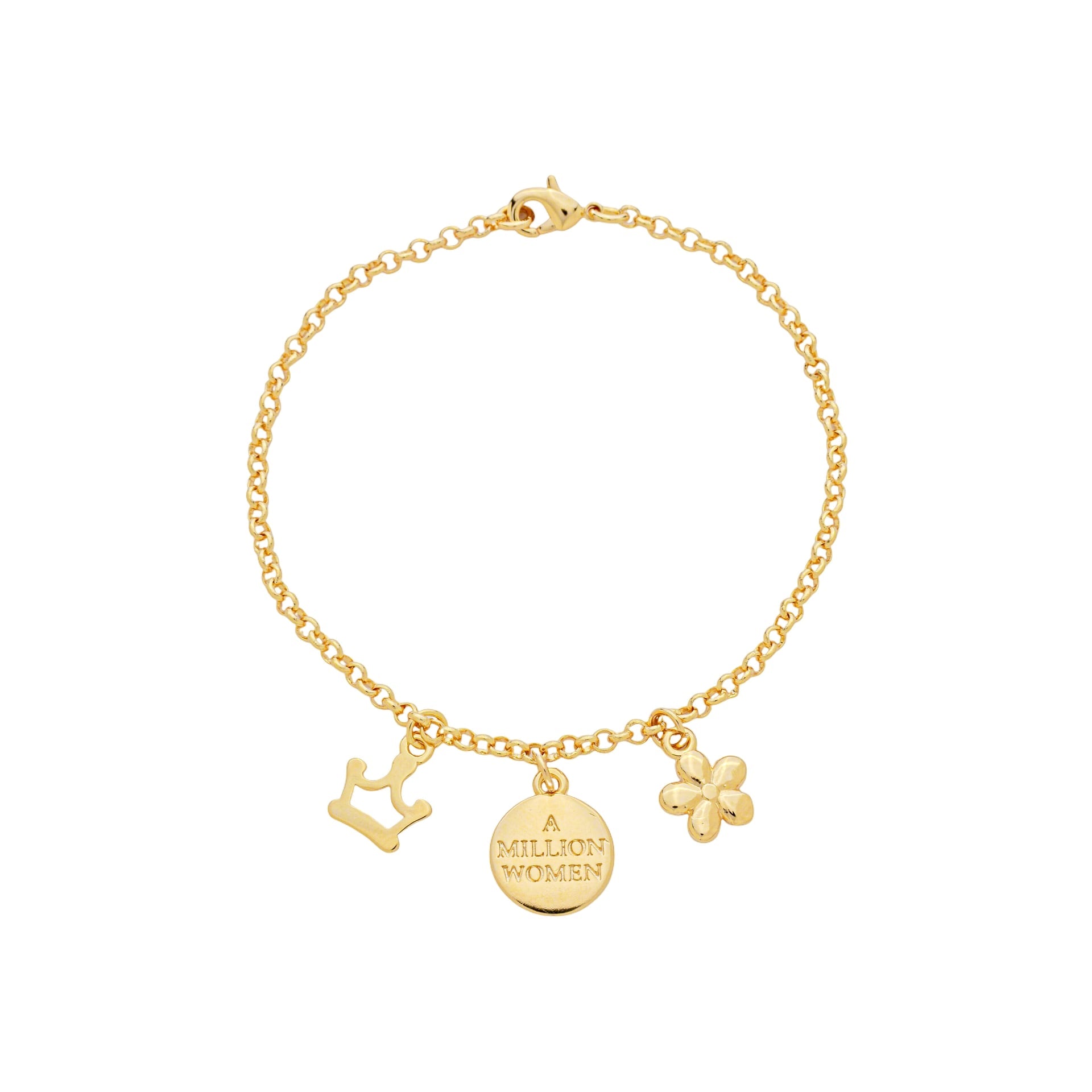 Pulseira linda e delicada com três pingentes Coroa, tag A million Women e flor de murta , em corrente de elo português.