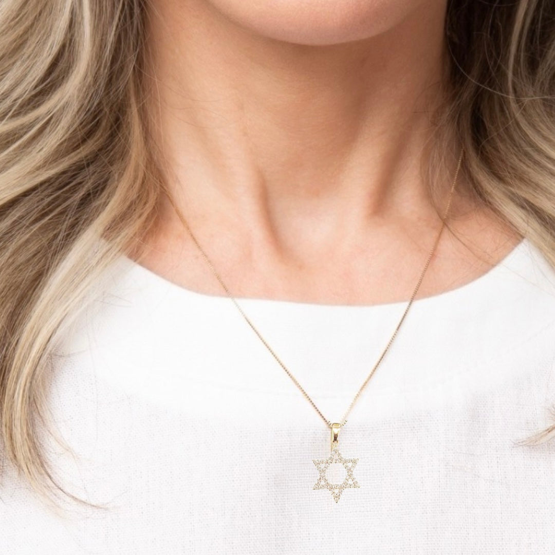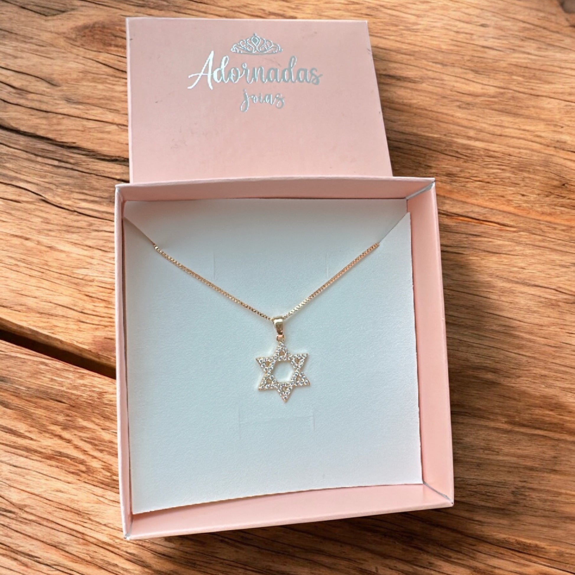 Lindo colar com pingente Estrela de Davi cravejada de zircônia.